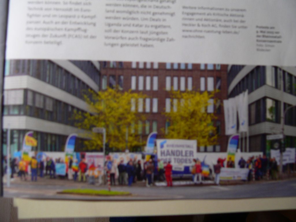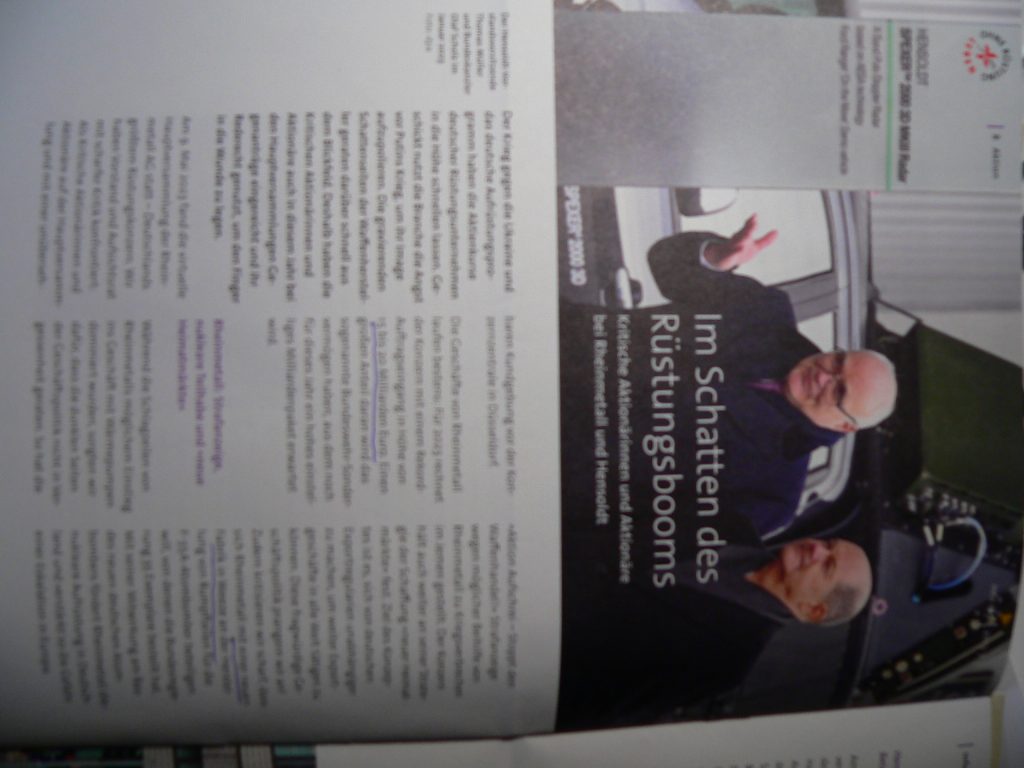 Bei beiden Firmen haben sich „Ohne Rüstung leben“ und andere als Kleinaktionäre Mitsprache und Mitinformation gesichert. Gleichzeitig gibt es Aktionen, in denen die Machenschaften dieser Firmen an die Öffentlichkeit gebracht werden, so z.B. am 9. Mai 2023 mit einer großen Mahnwache vor der Rheinmetall-Konzernzentrale.