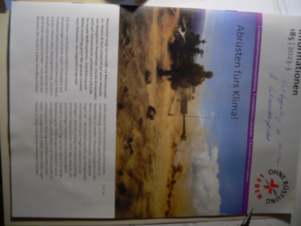 Das Heft beginnt mit einer (ironischen) Bemerkung über plötzliches Engagement gerade von Rüstungsfirmen in grünen Produkten, um dann natürlich zu betonen, dass das Militär und seine Zulieferer das genaue Gegenteil von klimafreundlich sind. Ich möchte hinzufügen: per se große Verursacher von Co2 und Großverbraucher von Ressourcen sind.